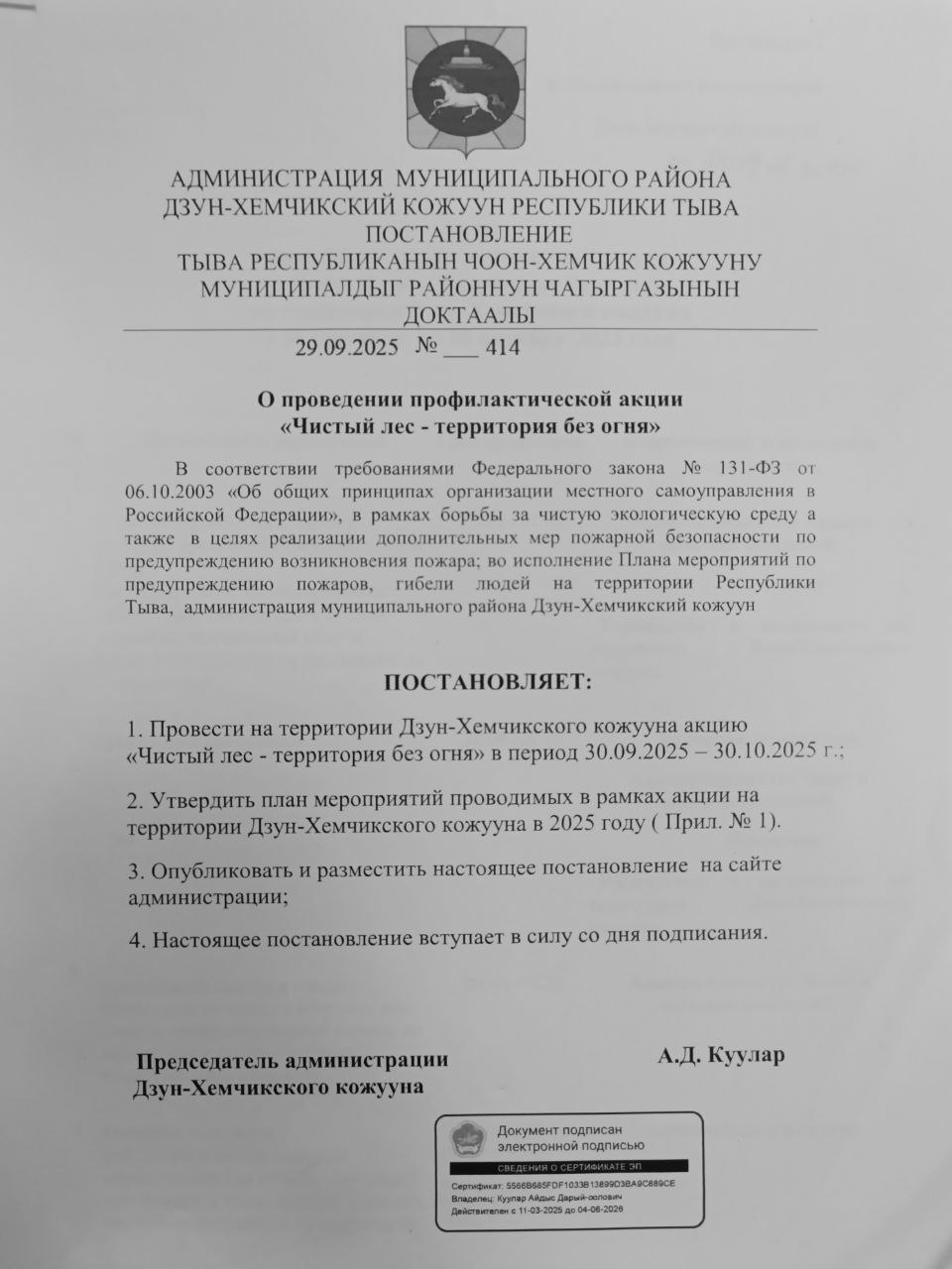 Постановление № 414 от 29.09.2025 О проведении профилактической акции "Чистый лес- территория без огня"